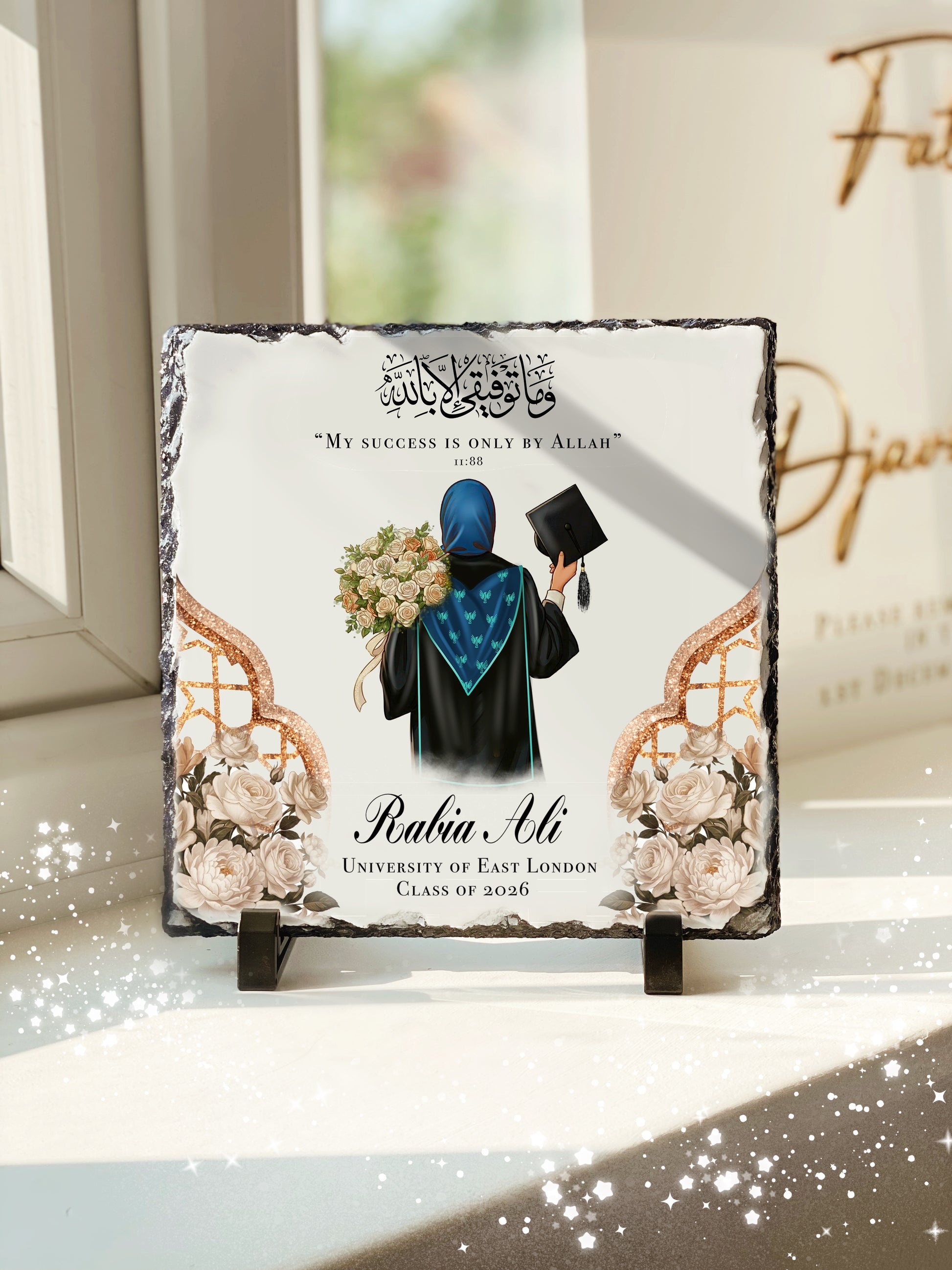 Heavyweight Custom Sash Hijabi Graduation Women’s Slate with Personalised Names and Stand (20x20cm)
