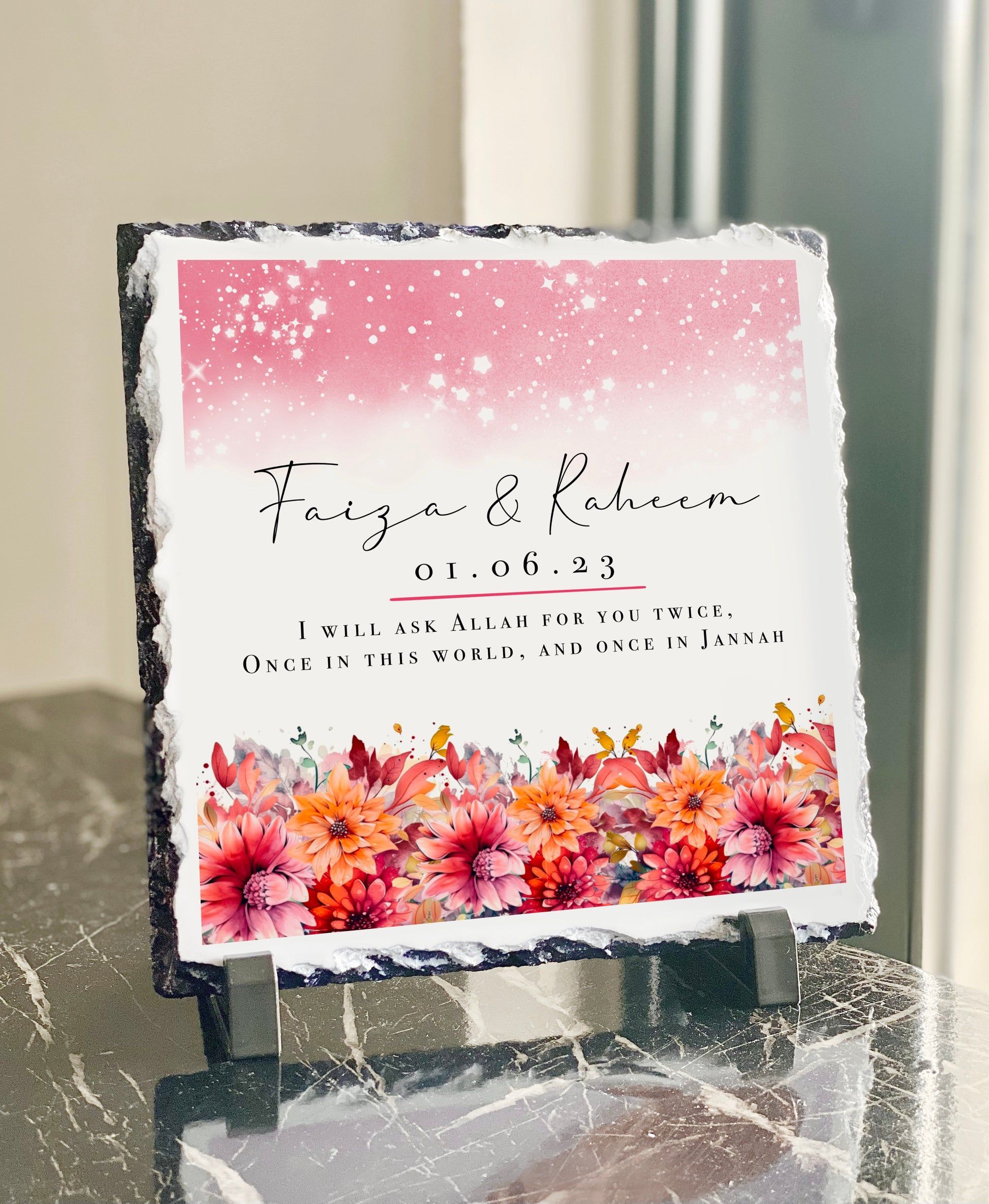 Couples Marriage Nikkah Floral Slate with Personalised Names and Stand (20x20cm)