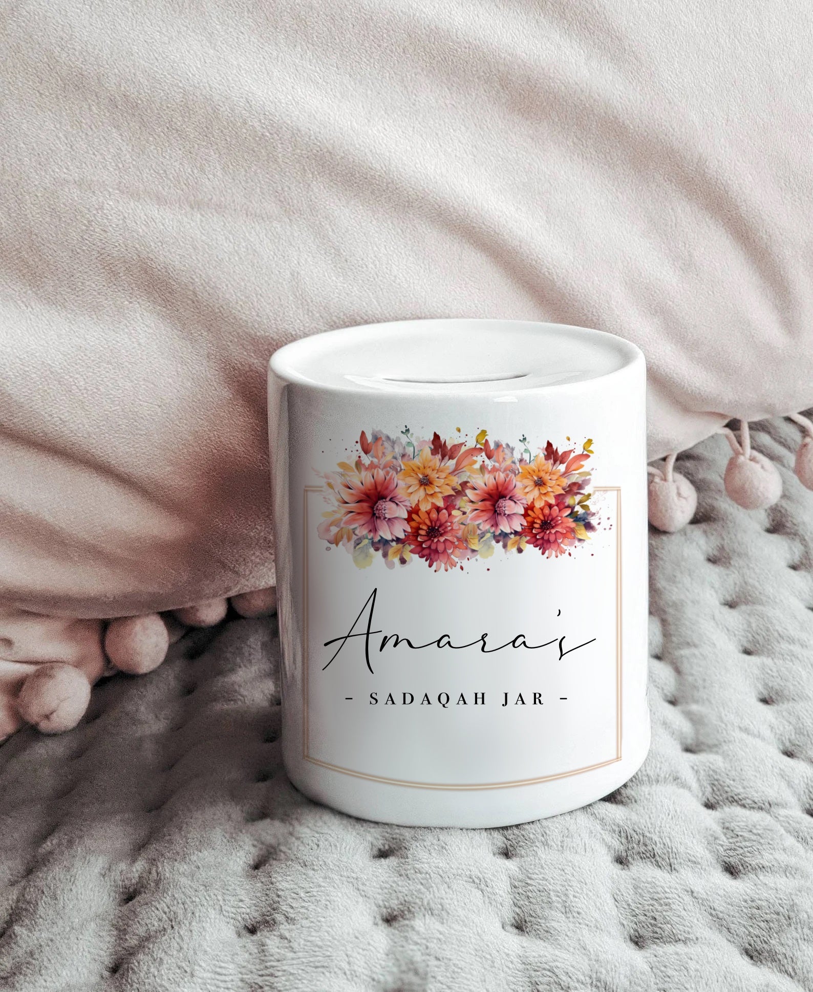 Floral Personalised Islamic Sadaqah Jar with Removable Plug