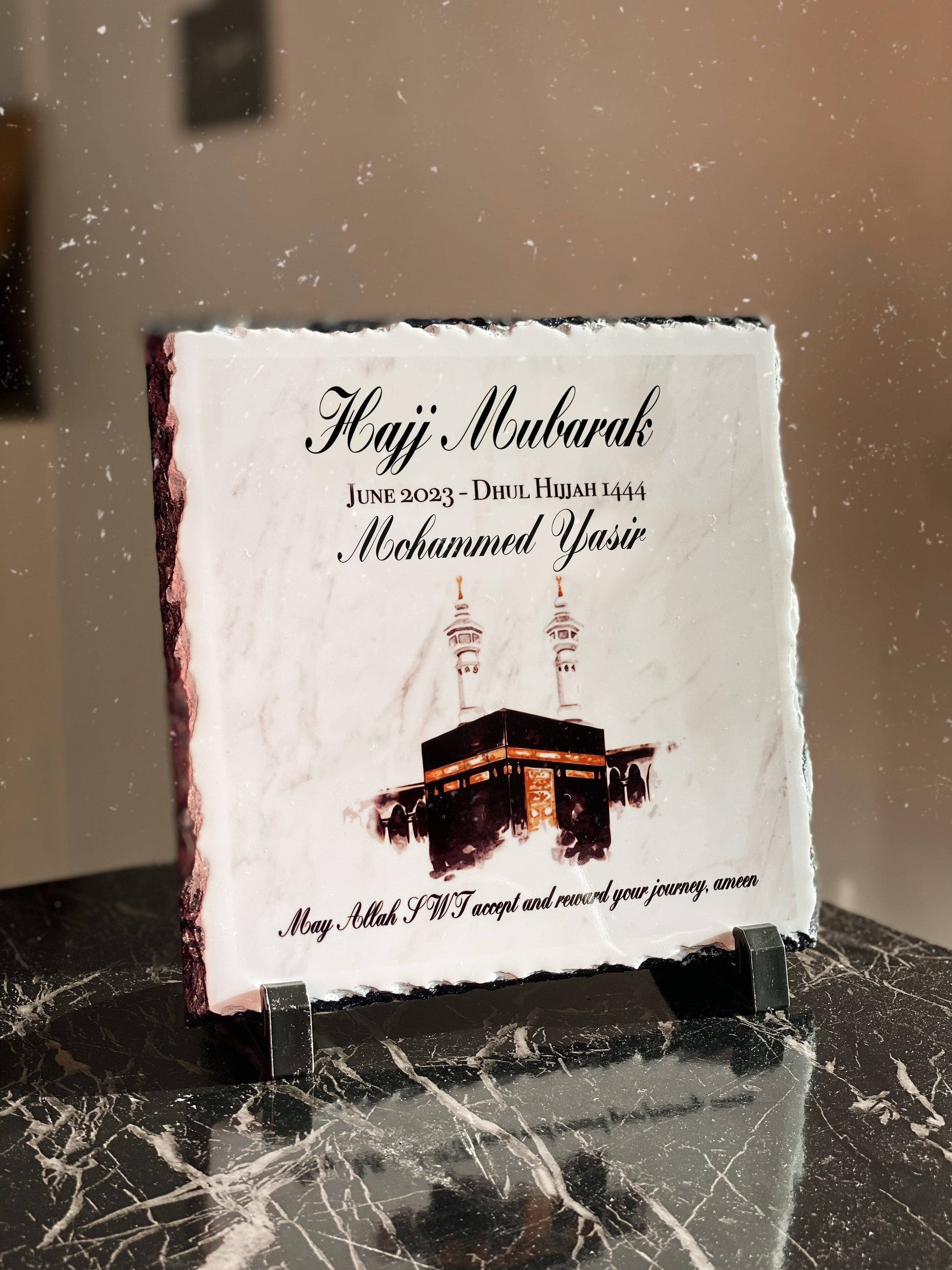 Hajj Mubarak Slate with Personalised Names and Stand (20x20cm)