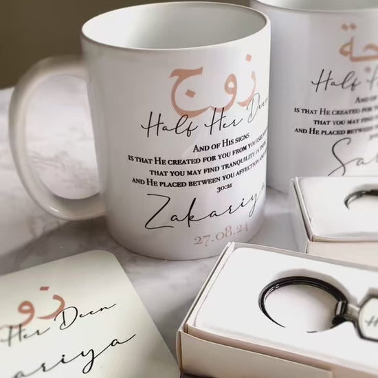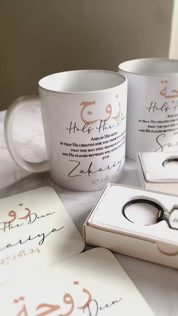 Set of 2 Personalised Islamic Married Couples "Half Your Deen" Mugs & Coasters Set