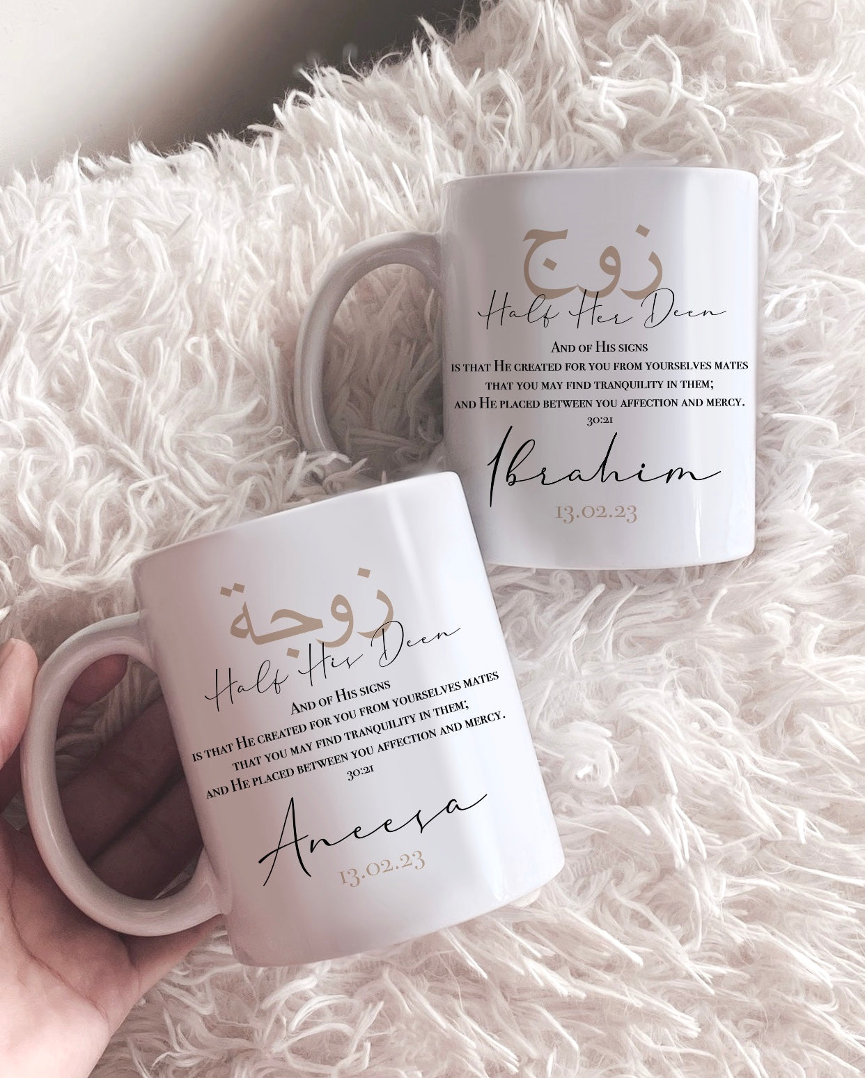 Set of 2 Personalised Islamic Married Couples "Half Your Deen" Mugs & Coasters & Keychains
