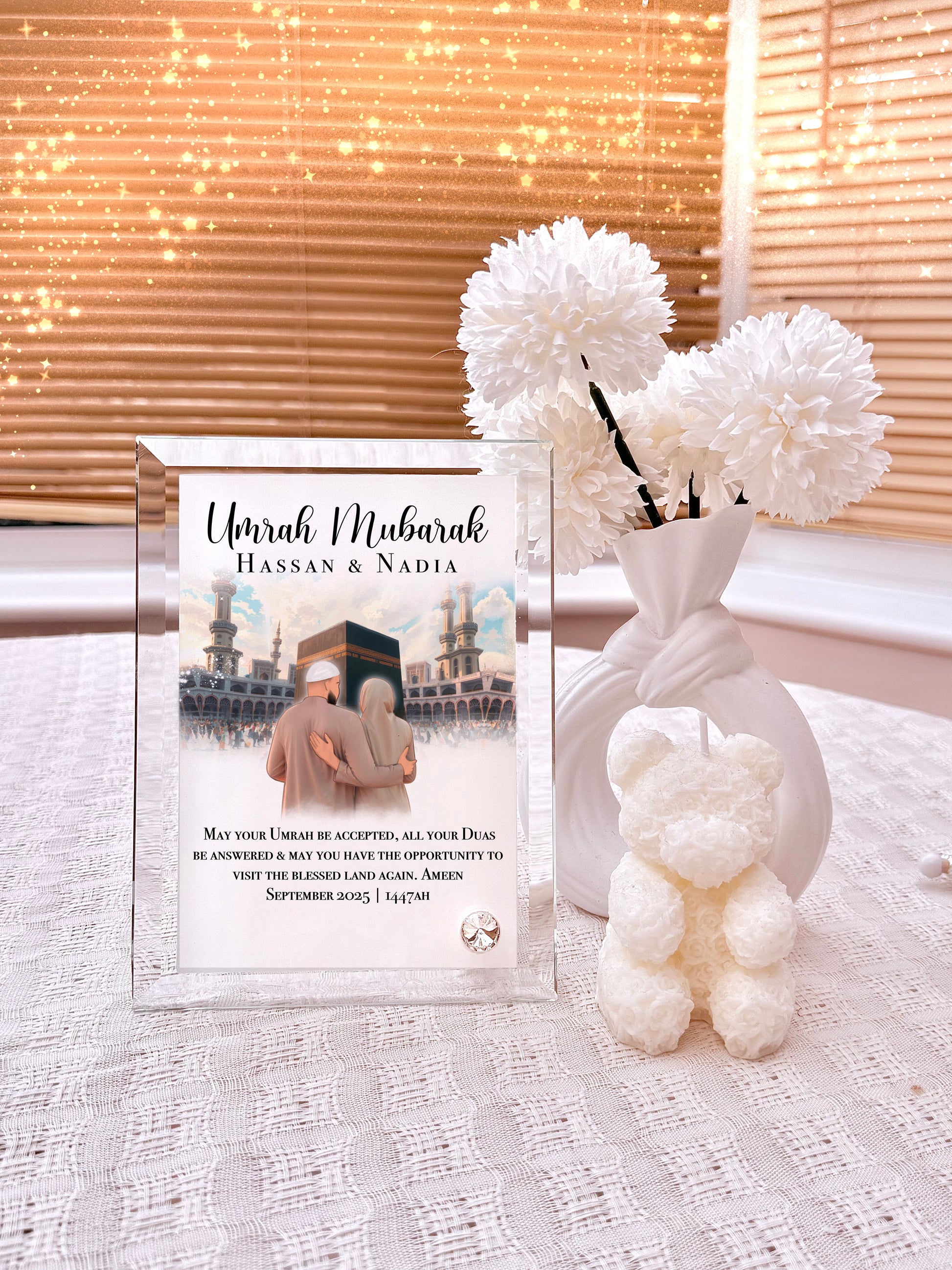 Umrah Mubarak Gift Kabah Couples Husband and Wife Masjid Crystal Glass Frame with Personalised Names and Stand (18x13cm)
