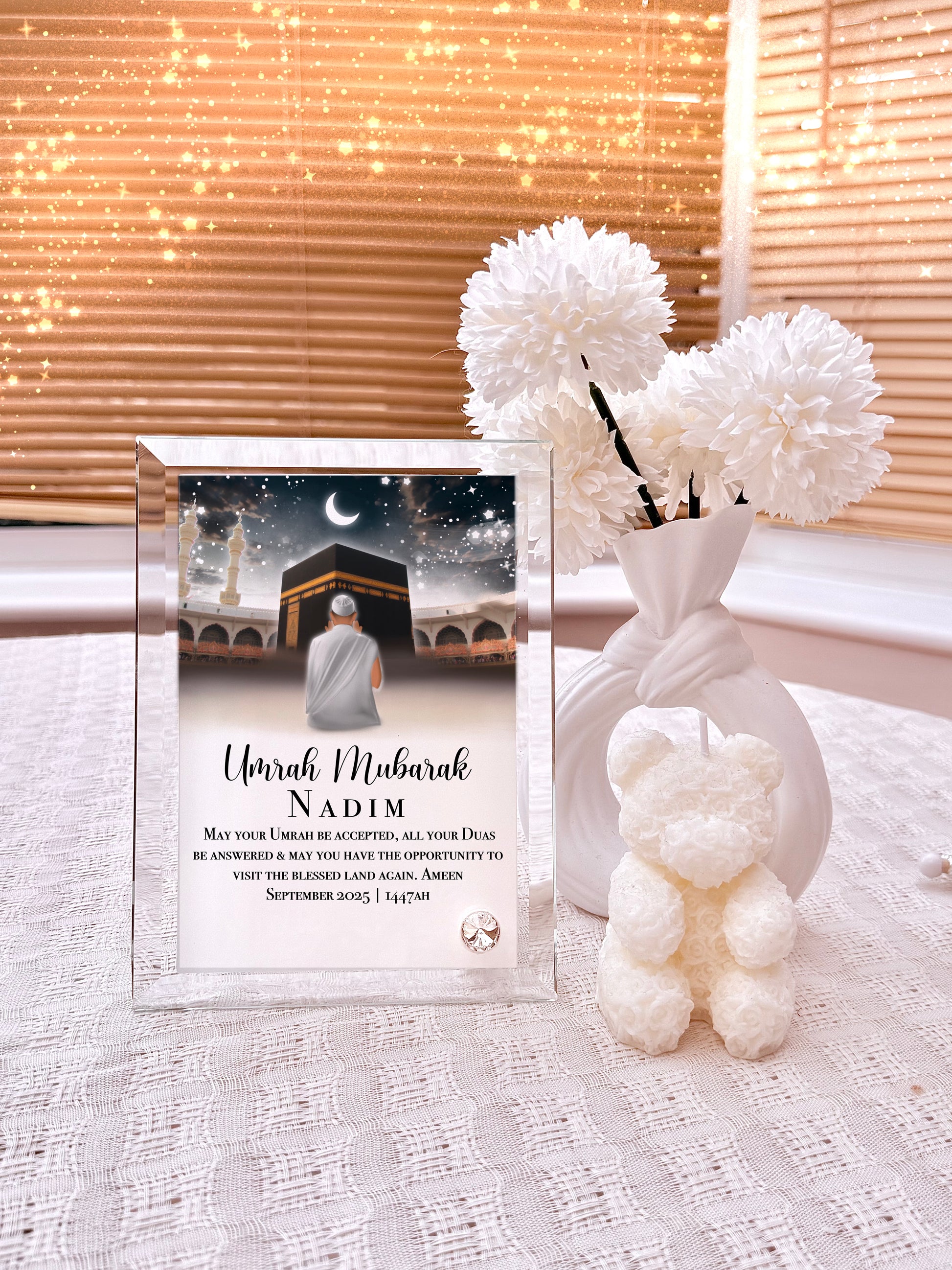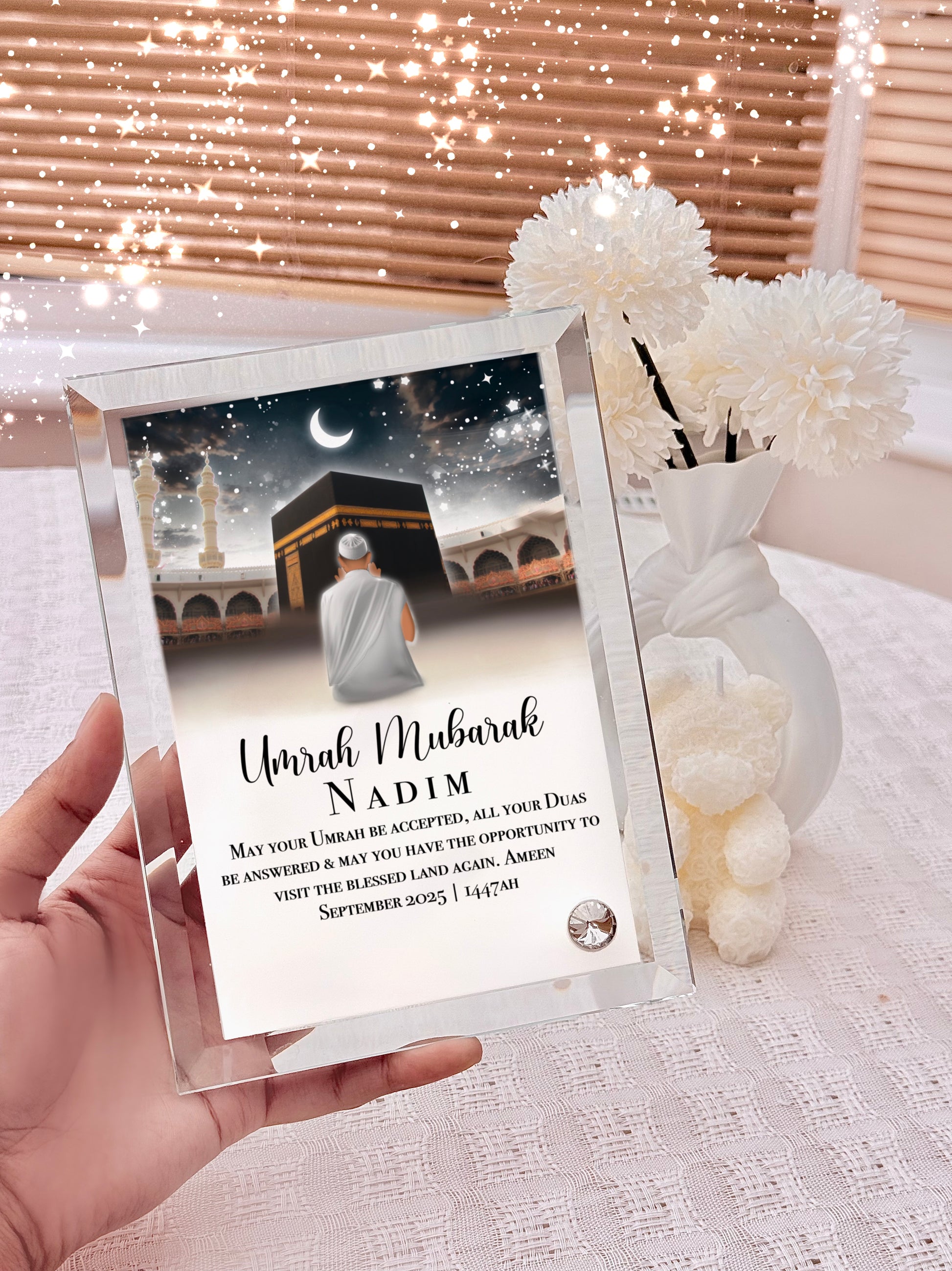 Umrah Mubarak Gift Mens Masjid Crystal Glass Frame with Personalised Names and Stand (18x13cm)