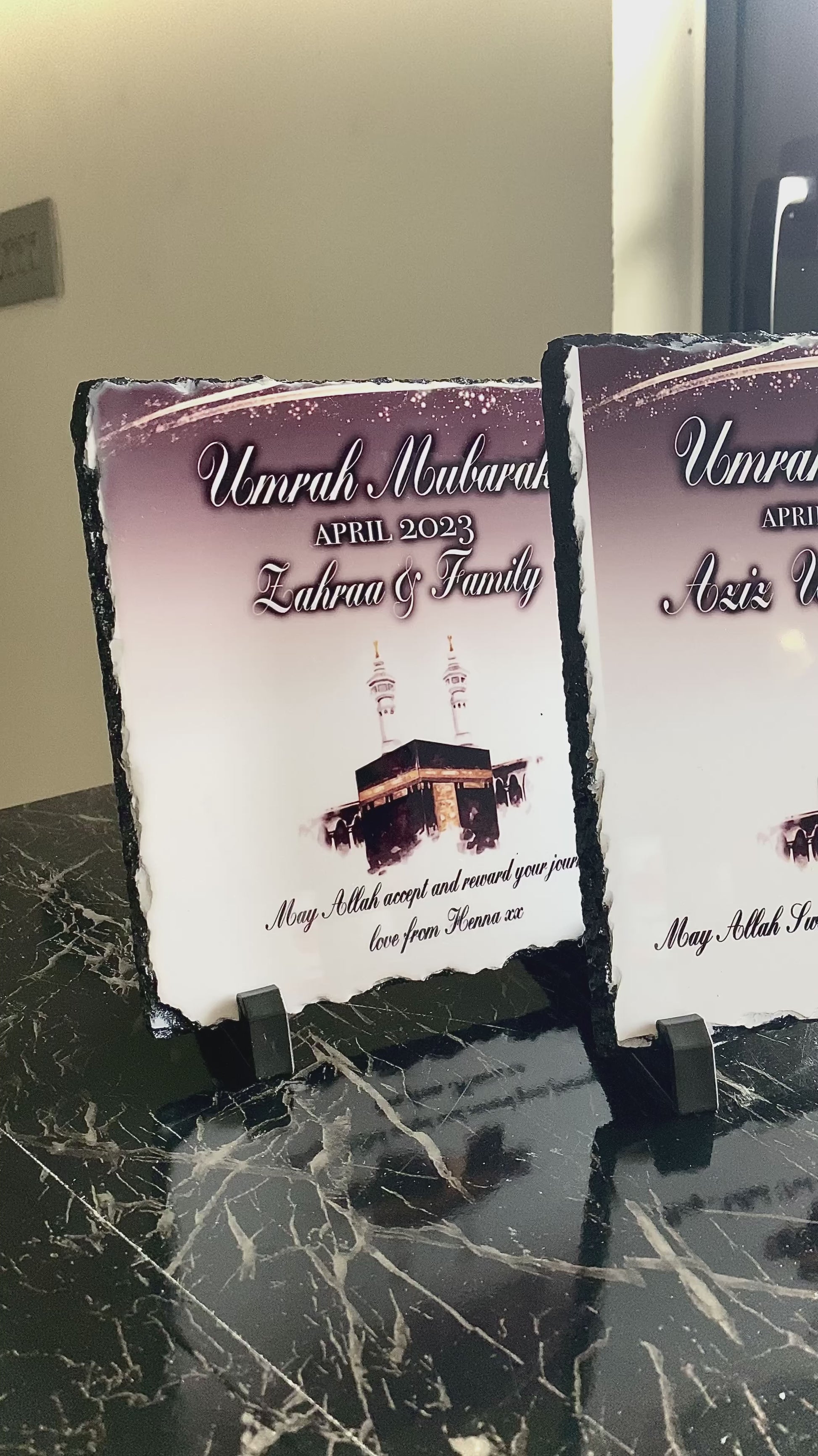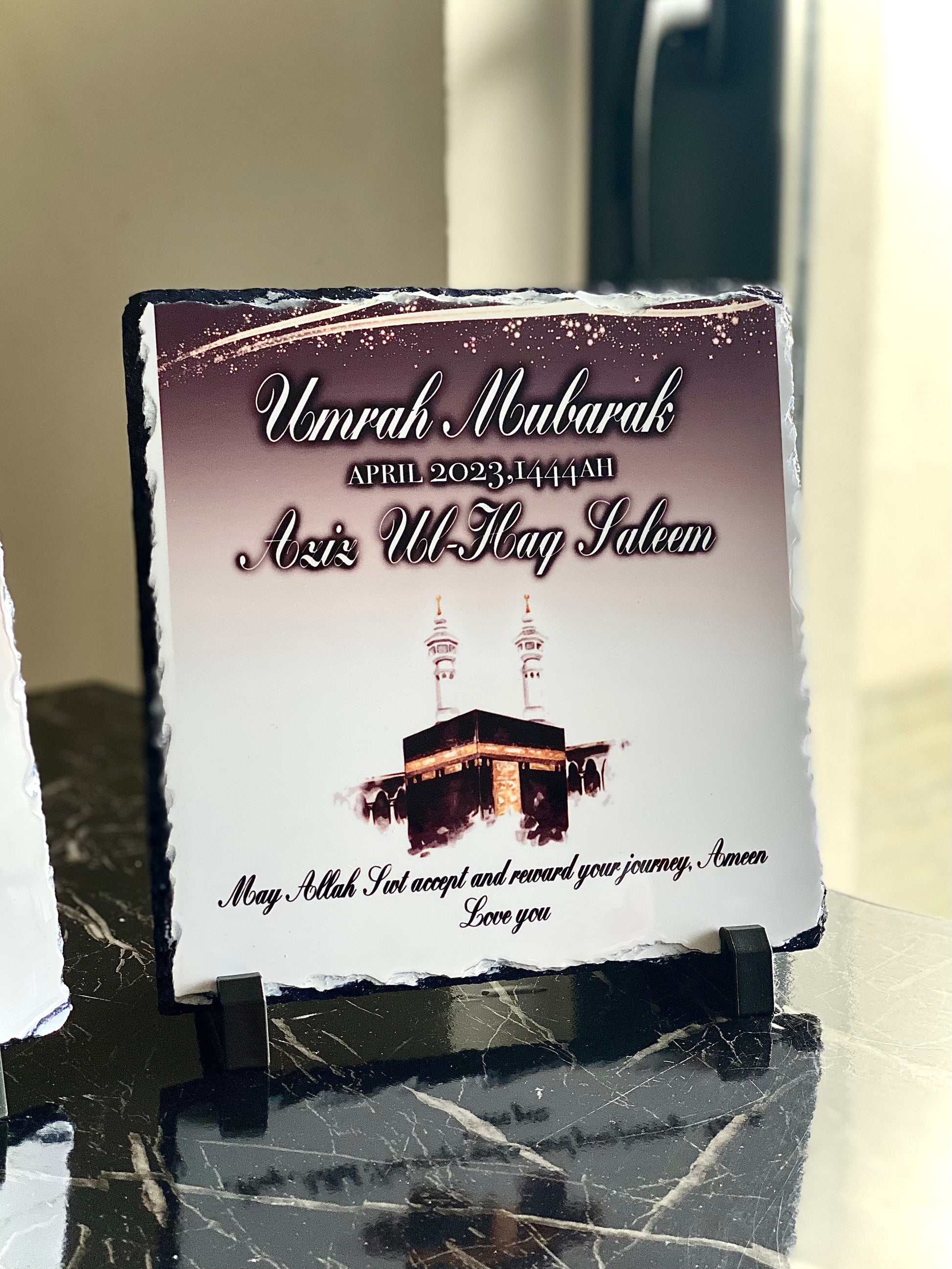 Umrah Mubarak Slate with Personalised Names and Stand (20x20cm)